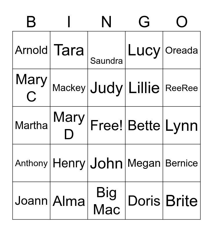 This bingo card has a free space and 74 words: Annie, Maggie, Saundra, Evelyn B, Claudine, Estela, Ralph, Gwendolyn, Joann, Sally, Stephanie C, Carol, Judy, Mary C, Janis, Mary D, Abby, ReeRee, Dottie, Martha, Mackey, Tara, Lucy, Mamie, Brite, Cleo, Yvonne, Sara, Evelyn J, Delorise, Oreada, Ossie, Shahnaz, Rebecca, Bessie, Doris, Giovanna, Lisa, Willie, Joan, Big Mac, Alma, Karen, Jerry, Rouhollah, Arnold, Alice, Henry, Emma, Bert, Jacqui, Katie, Lynn, Marcella, Duet, Willietta, John, Flo, Virginia, Bernice, Lillie, Ruby, Anthony, Evelyn, Bette, Rae, Senior, Nutrition, Megan, Yolonda, Stephanie N, Damitria, Cara and Terence.