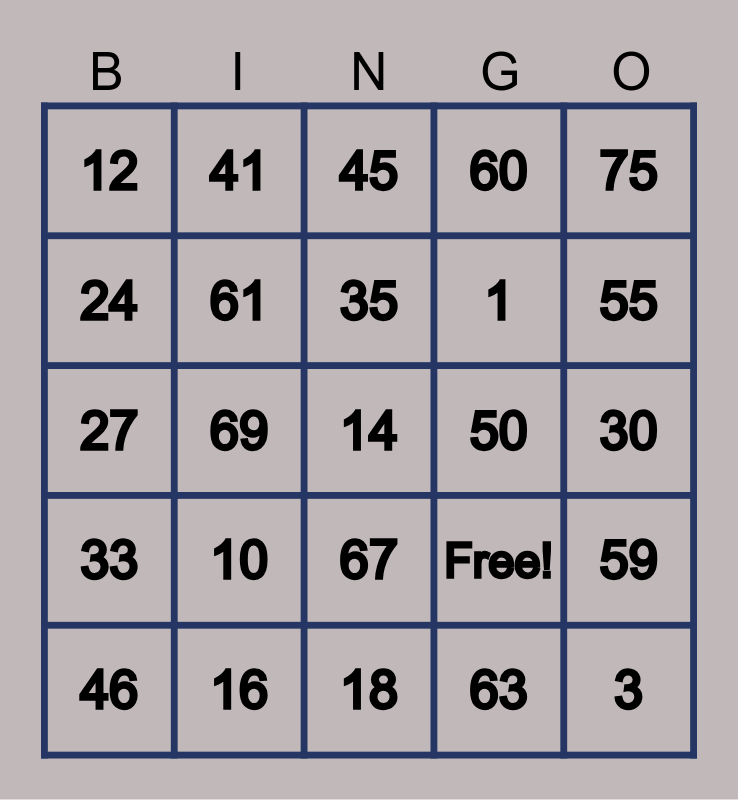 This bingo card has 25 words: 10, 18, 35, 46, 75, 12, 24, 41, 50, 67, 1, 27, Free!, 59, 61, 3, 30, 45, 55, 69, 14, 16, 33, 60 and 63.