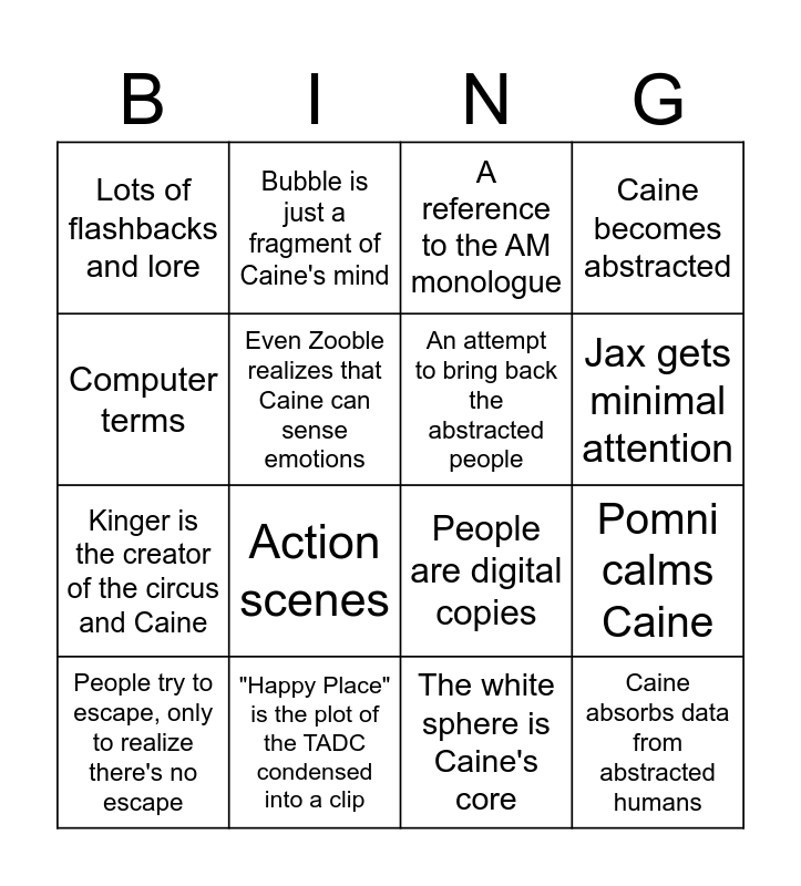 This bingo card has 18 words: Action scenes, Caine absorbs data from abstracted humans, A reference to the AM monologue, Lots of flashbacks and lore, People are digital copies, Caine becomes abstracted, People try to escape, only to realize there's no escape, Bubble is just a fragment of Caine's mind, Jax gets minimal attention, Kinger is the creator of the circus and Caine, The white sphere is Caine's core, Computer terms, Pomni calms Caine, Even Zooble realizes that Caine can sense emotions, An attempt to bring back the abstracted people, Pomni gets her moment of glory, "Happy Place" is the plot of the TADC condensed into a clip and Caine is a complete circus, from the location itself to all the NPCs.