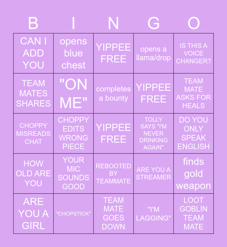 This bingo card has a free space and 29 words: ARE YOU A GIRL, ARE YOU A STREAMER, CHOPPY EDITS WRONG PIECE, WHERE ARE YOU FROM, CAN I ADD YOU, YIPPEE FREE, "ON ME", YOUR MIC SOUNDS GOOD, TOLLY SAYS "I'M NEVER DRINKING AGAIN", "CHOPSTICK", DO YOU ONLY SPEAK ENGLISH, LOOT GOBLIN TEAM MATE, TEAM MATE GOES DOWN, "I'M LAGGING", TEAM MATE ASKS FOR HEALS, CHOPPY ASKS "DO YOU LIKE THE NEW SEASON?", REBOOTED BY TEAMMATE, HOW OLD ARE YOU, IS THIS A VOICE CHANGER?, CHOPPY MISREADS CHAT, ARE YOU A STREAMER, PLACE TOP 10, YIPPEE FREE, TEAM MATES SHARES, opens a llama/drop, opens blue chest, finds gold weapon, completes a bounty and choppy swears.