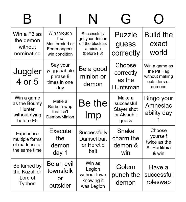 This bingo card has a free space and 24 words: Execute the demon day 1, Be an evil townsfolk or outsider, Be a good minion or demon, Be turned by the Kazali or Lord of Typhon, Build the exact world, Win a F3 as the demon without nominating, Juggler 4 or 5, Win through the Mastermind or Fearmonger's win condition, Make a successful Slayer shot or Alsaahir guess, Successfully Damsel bait or Heretic bait, Choose correctly as the Huntsman, Win a game as the Bounty Hunter without dying before F5, Snake charm the demon & win, Choose yourself twice as the Al-Hadikhia & win, Say your yaggababble phrase 8 times in one day, Golem punch the demon, Bingo your Amnesiac ability day 1, Successfully get your demon off the block as a minion (before F3), Win a game as the Pit Hag without making outsiders or demons, Make a Barber swap that isn't Demon/Minion, Have a successful roleswap, Experience multiple forms of madness at the same time, Puzzle guess correctly and Win as Legion without town knowing it was Legion.