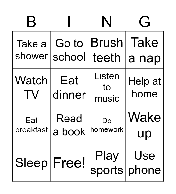 This bingo card has 16 words: Free!, Wake up, Brush teeth, Take a shower, Eat breakfast, Go to school, Do homework, Play sports, Watch TV, Eat dinner, Sleep, Take a nap, Read a book, Help at home, Listen to music and Use phone.