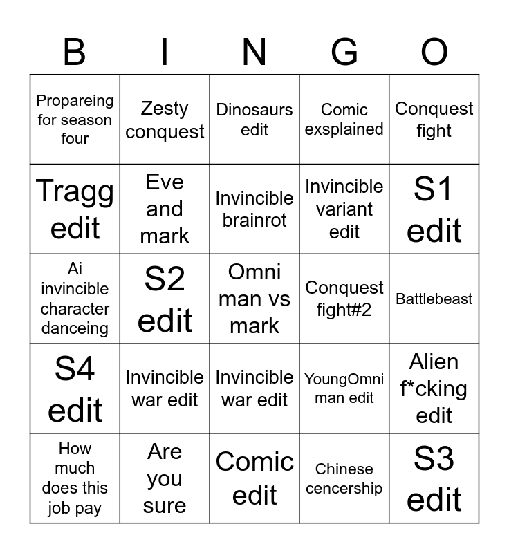This bingo card has a free space and 24 words: Invincible war edit, Are you sure, Invincible brainrot, How much does this job pay, Conquest fight, Propareing for season four, Tragg edit, Zesty conquest, Conquest fight#2, Invincible war edit, Invincible variant edit, Ai invincible character danceing, YoungOmni man edit, Alien f*cking edit, Eve and mark, Chinese cencership, Battlebeast, Dinosaurs edit, S1 edit, S2 edit, S3 edit, S4 edit, Comic exsplained and Comic edit.