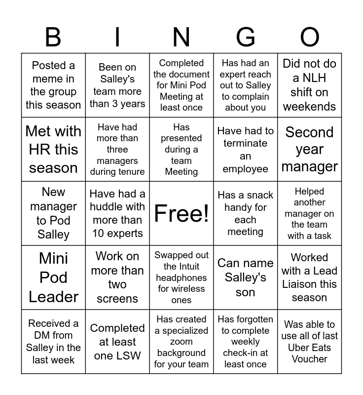 This bingo card has a free space and 34 words: First year Manager, Has forgotten to complete weekly check-in at least once, Has not clicked on any of the Spreadsheets, Can name state Salley lives in, Mini Pod Leader, Have had more than three managers during tenure, Did not do a NLH shift on weekends, Received a DM from Salley in the last week, Been on Salley's team more than 3 years, Have taken reassigned engagements from other managers, Has presented during a team Meeting, Completed the document for Mini Pod Meeting at least once, Can name all the FTEs on the team, Posted a message in the team channel this month, Has a snack handy for each meeting, Second year manager, Completed at least one LSW, New manager to Pod Salley, Work on more than two screens, Can name Salley's son, Swapped out the Intuit headphones for wireless ones, Most likely to have camera off in Zoom meeting, Posted a meme in the group this season, Helped another manager on the team with a task, Has created a specialized zoom background for your team, Was able to use all of last Uber Eats Voucher, Has had an expert reach out to Salley to complain about you, Completed Mid season meetings early, Have had to terminate an employee, Met with HR this season, Found an error in a report shared with experts, Have had a huddle with more than 10 experts, Worked with a Lead Liaison this season and Mentor for other managers.