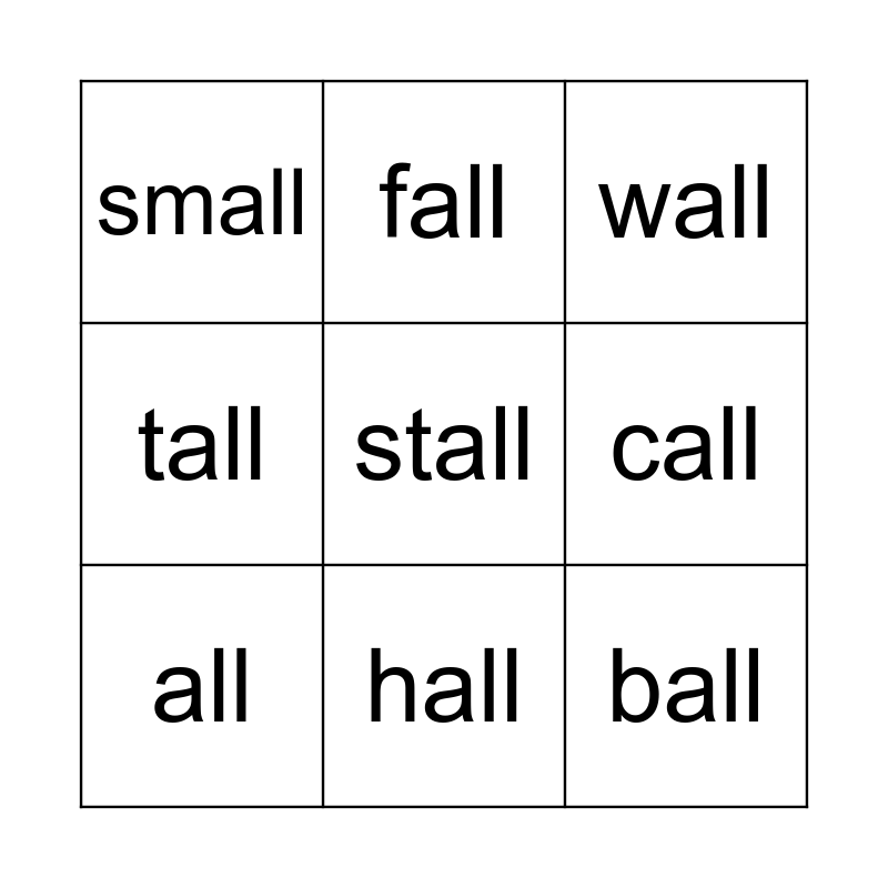 This bingo card has 9 words: all, wall, fall, tall, small, call, stall, ball and hall.