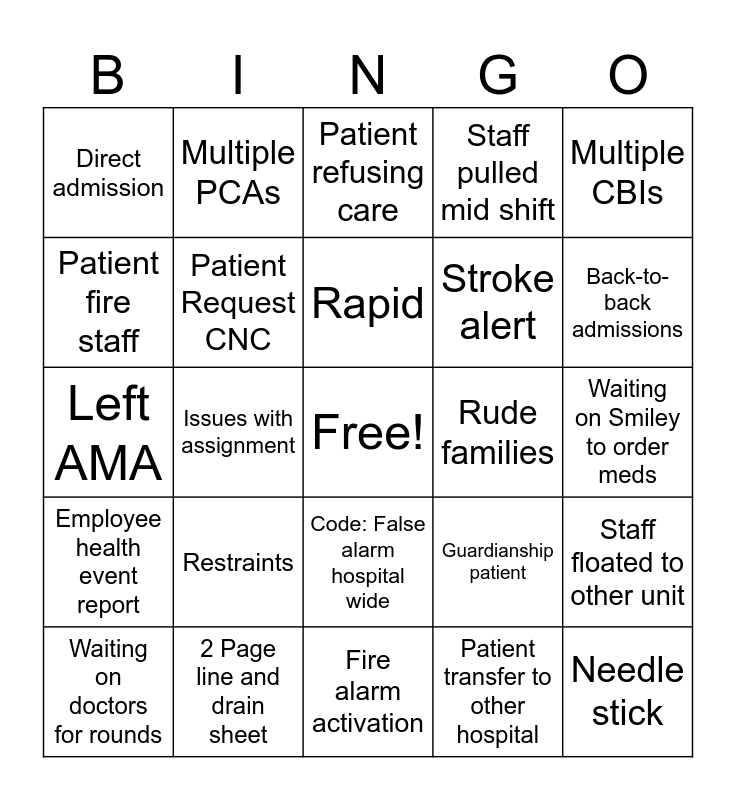 This bingo card has a free space and 80 words: 3 Discharges on one nurse, Racist patient, Patient refusing care, Death, Super Charge, Staff Cry, No Pens, Over 12 DC’s, Patient Urinate on Floor, Code Blue, Understaff on Nurses, Understaff on PCTs, Staff pulled mid shift, Direct admission, Combative patient, Patient fire staff, Code Brown, Restraints, Security event, Waiting on Smiley to order meds, Patient Fall, Multiple CBIs, Left AMA, Rapid, Patient Request CNC, Found drugs, Leaky Ostomy, Works with Kelsey/Lauryn, Emergency transfer, Body fluids touch skin, Back-to-back admissions, Home pharmacy issues, Fire alarm activation, Patient yelling, Waiting on doctors for rounds, Rude families, Nurses floated to another unit, Family press staff assist, Losing tele box 15+ min, Needle stick, Condom cath fails 3x, Patient refuses to leave, DC order in, med red not done, Patients removing their own IV, Connie gets 3 IVs in one shift, Multiple PCAs, Multiple blood transfusions, Late staff call out, NCNS, Family member down, Staff floated to other unit, Issues with assignment, Guardianship patient, Katie misses IV/blood draw, 3 confused patients on a nursing assignment, 5 sugar checks for one nurse, 8 ACHS for techs, NS complaints, O Complaints, Code: False alarm hospital wide, Stroke alert, 2 or more sitters, Stormi/ Arletty late to huddle, Admission at 17:45, Patient throwing stuff, DCL comes to unit; patient not ready, Oncology stealing supplies, Stormi “parents” a patient, Ryan calls a Pow-Wow, EMS late/delayed, Employee health event report, 2 Page line and drain sheet, MVC needs placement, Medicaid needs SNF, Patient requests patient advocate, Patient has inappropriate CM/SW request, Patient transfer to other hospital, Patient pees on floor, Family is a nurse and Patient is a nurse.