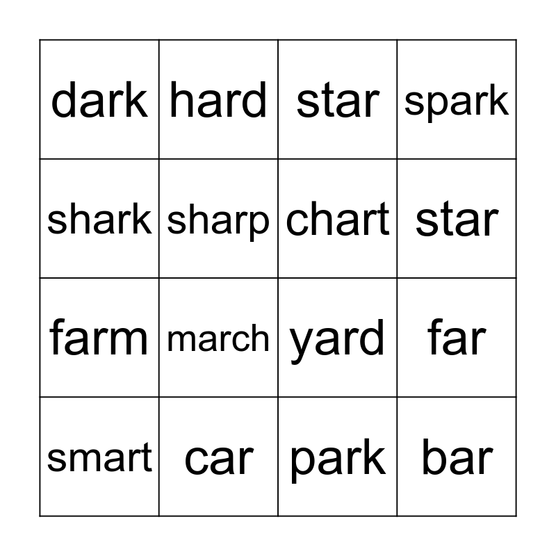 This bingo card has 16 words: car, far, star, dark, farm, hard, yard, park, shark, sharp, smart, spark, march, star, chart and bar.