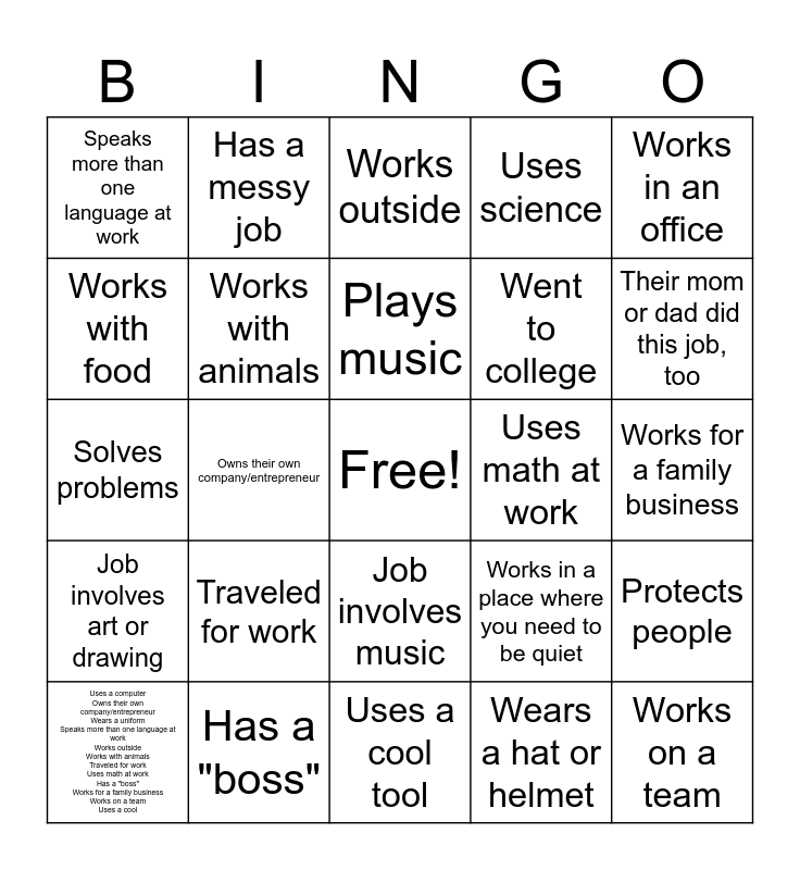 This bingo card has a free space and 29 words: Uses a computer Owns their own company/entrepreneur Wears a uniform Speaks more than one language at work Works outside Works with animals Traveled for work Uses math at work Has a "boss" Works for a family business Works on a team Uses a cool, Uses a computer, Owns their own company/entrepreneur, Wears a uniform, Speaks more than one language at work, Works outside, Works with animals, Traveled for work, Uses math at work, Has a "boss", Works for a family business, Works on a team, Uses a cool tool, Wears a hat or helmet, Their mom or dad did this job, too, Helps people, Job involves music, Job involves art or drawing, Works in an office, Solves problems, Works in a place where you need to be quiet, Wears a name tag, Went to college, Works with food, Uses science, Has a messy job, Protects people, Plays music and company or business has a TV commercial.