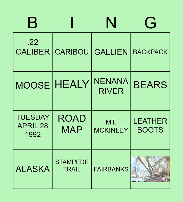 This bingo card has 1 images and 16 words: FAIRBANKS, ALASKA, GALLIEN, .22 CALIBER, ROAD MAP, BACKPACK, LEATHER BOOTS, NENANA RIVER, BEARS, HEALY, STAMPEDE TRAIL, MT. MCKINLEY, MOOSE, CARIBOU, TUESDAY APRIL 28 1992 and ANCHORAGE.
