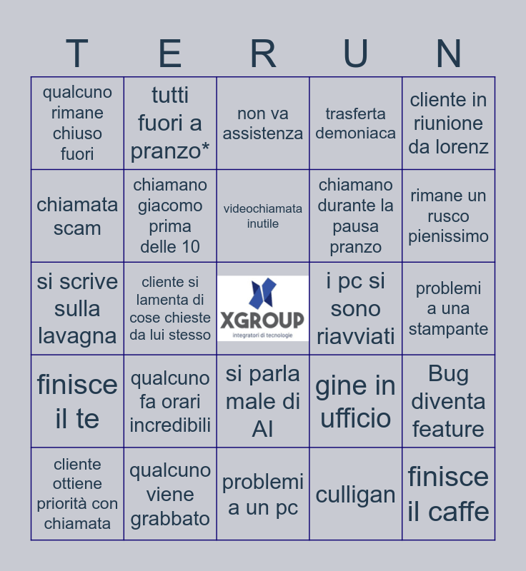 This bingo card has a free space and 34 words: sbagliano al citofono, culligan, problemi macchina caffe, ciao so carmine, finisce il te, chiamano giacomo prima delle 10, cliente in riunione da lorenz, cliente ottiene priorità con chiamata, tutti fuori a pranzo*, cliente non manda materiale richiesto, videochiamata inutile, non va assistenza, entra marcello, in server rack fa suoni sospetti, i pc si sono riavviati, rimane un rusco pienissimo, qualcuno viene grabbato, si scrive sulla lavagna, qualcuno fa orari incredibili, gine in ufficio, si parla male di AI, cliente non risponde dopo aver chiesto assistenza, qualcuno rimane chiuso fuori, problemi a una stampante, problemi a un pc, finisce il caffe, trasferta demoniaca, progetto esplode in produzione, chiamano durante la pausa pranzo, chiamata scam, problemi 3cx, cliente si lamenta di cose chieste da lui stesso, Bug diventa feature and muore qualcuno di famoso.