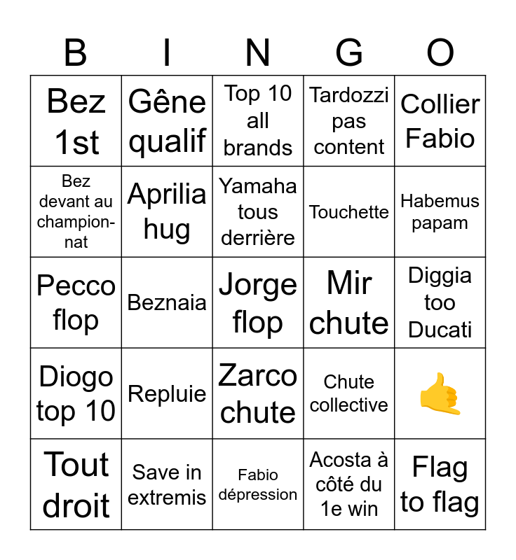 This bingo card has a free space and 24 words: Repluie, Save in extremis, Yamaha tous derrière, Tout droit, Collier Fabio, Bez 1st, Bez devant au champion-nat, Gêne qualif, Mir chute, Zarco chute, Touchette, Pecco flop, Chute collective, 🤙, Aprilia hug, Acosta à côté du 1e win, Diggia too Ducati, Top 10 all brands, Habemus papam, Beznaia, Flag to flag, Diogo top 10, Tardozzi pas content and Fabio dépression.