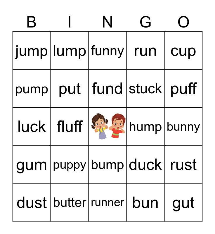 This bingo card has a free space and 24 words: puppy, butter, fund, dust, cup, jump, pump, lump, hump, bump, stuck, luck, duck, rust, put, bun, bunny, funny, puff, fluff, gut, gum, run and runner.