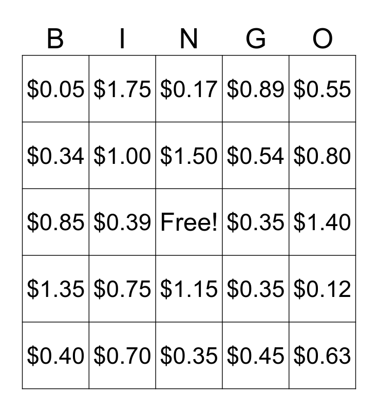 This bingo card has a free space and 24 words: $0.75, $0.70, $1.50, $0.40, $0.55, $0.05, $0.34, $1.75, $0.35, $1.15, $0.54, $0.85, $0.35, $0.12, $1.00, $0.45, $1.40, $0.17, $0.80, $0.39, $0.63, $1.35, $0.89 and $0.35.