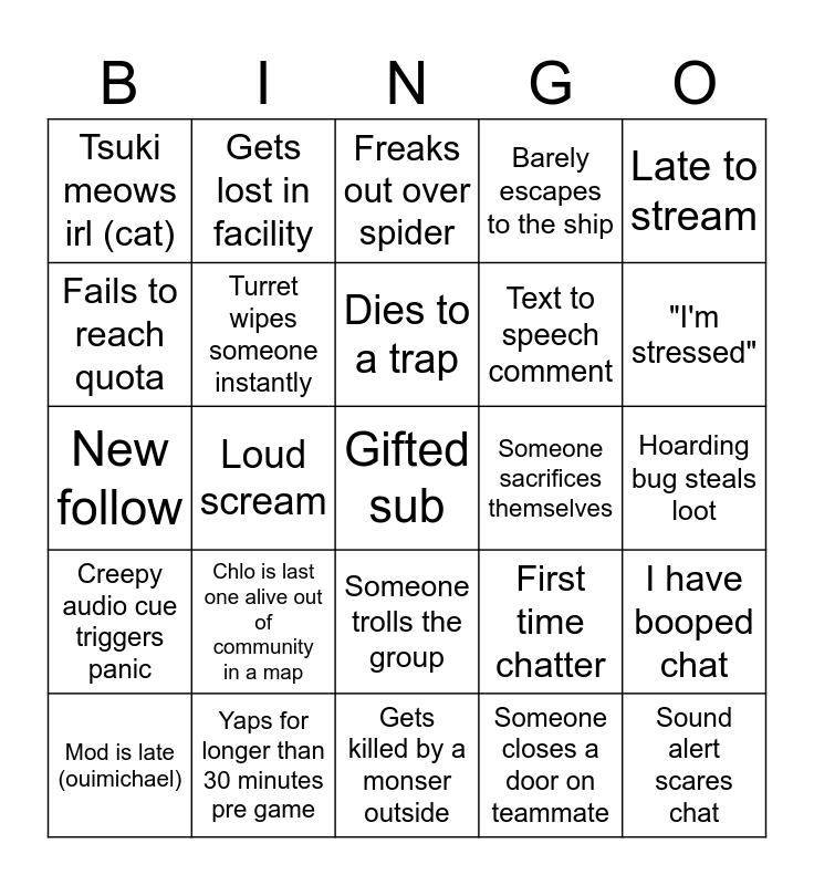 This bingo card has a free space and 24 words: Chlo is last one alive out of community in a map, Yaps for longer than 30 minutes pre game, Dies to a trap, Mod is late (ouimichael), Late to stream, Tsuki meows irl (cat), Fails to reach quota, Gets lost in facility, Someone sacrifices themselves, Someone trolls the group, Text to speech comment, New follow, First time chatter, I have booped chat, Turret wipes someone instantly, Someone closes a door on teammate, Hoarding bug steals loot, Freaks out over spider, "I'm stressed", Loud scream, Sound alert scares chat, Creepy audio cue triggers panic, Barely escapes to the ship and Gets killed by a monser outside.