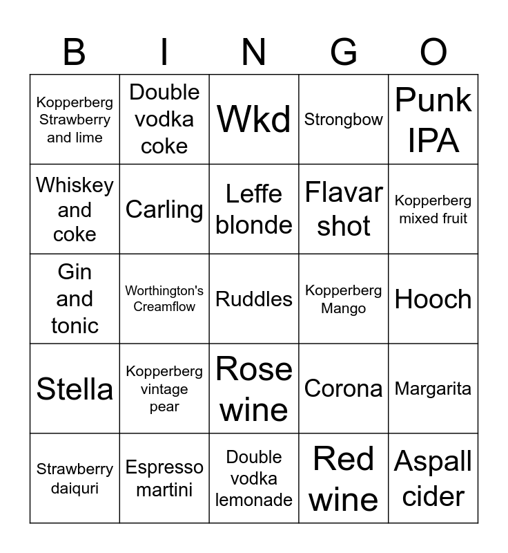 This bingo card has 36 words: Free!, Bud light with lime cordial, Carlsberg, Carling, Corona, Stella, Leffe blonde, Guiness, Punk IPA, Shipyard pale, Worthington's Creamflow, Strongbow, Strongbow Darkfruits, Kopperberg Mango, Kopperberg mixed fruit, Kopperberg Strawberry and lime, Aspall cider, Kopperberg vintage pear, Ruddles, Wkd, Hooch, Margarita, Espresso martini, Strawberry daiquri, Double vodka lemonade, Double vodka coke, Gin and tonic, Rum and coke, Flavar shot, Whiskey and coke, Vodka with juice, White wine, Red wine, Rose wine, Doom bar and Stowford press cider.