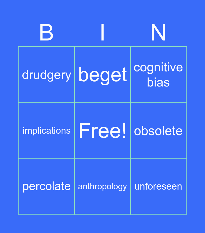 This bingo card has a free space and 8 words: implications, beget, obsolete, percolate, cognitive bias, drudgery, anthropology and unforeseen.
