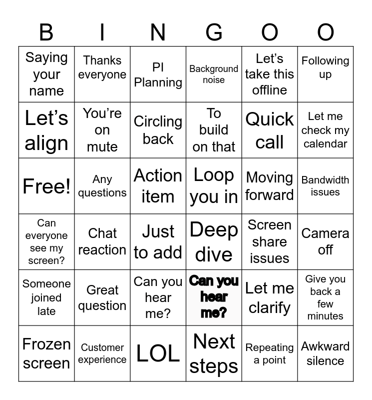 This bingo card has 36 words: Can you hear me?, Can you hear me?, Next steps, Let’s align, Can everyone see my screen?, Loop you in, You’re on mute, LOL, Let’s take this offline, Let me clarify, Let me check my calendar, Background noise, Give you back a few minutes, Any questions, To build on that, Saying your name, Someone joined late, Moving forward, Free!, PI Planning, Action item, Chat reaction, Deep dive, Just to add, Screen share issues, Thanks everyone, Quick call, Customer experience, Circling back, Following up, Awkward silence, Frozen screen, Camera off, Bandwidth issues, Great question and Repeating a point.
