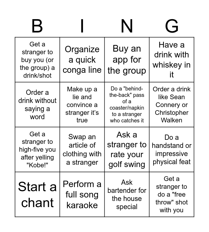 This bingo card has 31 words: Dribble thru a crowd, Do a choreographed dance alone, Do a handstand or impressive physical feat, Get someone to buy you a drink, Get a stranger to buy you (or the group) a drink/shot, Buy an app for the group, Do a "behind-the-back" pass of a coaster/napkin to a stranger who catches it, Yell “OPA” when someone drops something, Perform a full song karaoke, Order a drink in an accent, Ask bartender for the house special, Start a chant, Buy a round for the group, Tell a stranger a conspiracy theory, Swap an article of clothing with a stranger, Finish a drink and then do a touchdown celebration, Convince a bartender or stranger to give you a "technical foul" high-five, Hold a snake, Get a stranger to do a "free throw" shot with you, Convince a stranger to take a silly group photo pose with all 4 of you, Order a drink without saying a word, Say something in Spanish correctly & in the correct context, Shoot a napkin successfully into a trashcan, Organize a quick conga line, Get a stranger to high-five you after yelling "Kobe!", Make up a lie and convince a stranger it’s true, Have a drink with whiskey in it, Ask a stranger to rate your golf swing, Convince strangers at another table to toast to your group, Order a drink like Sean Connery or Christopher Walken and Plank somewhere.