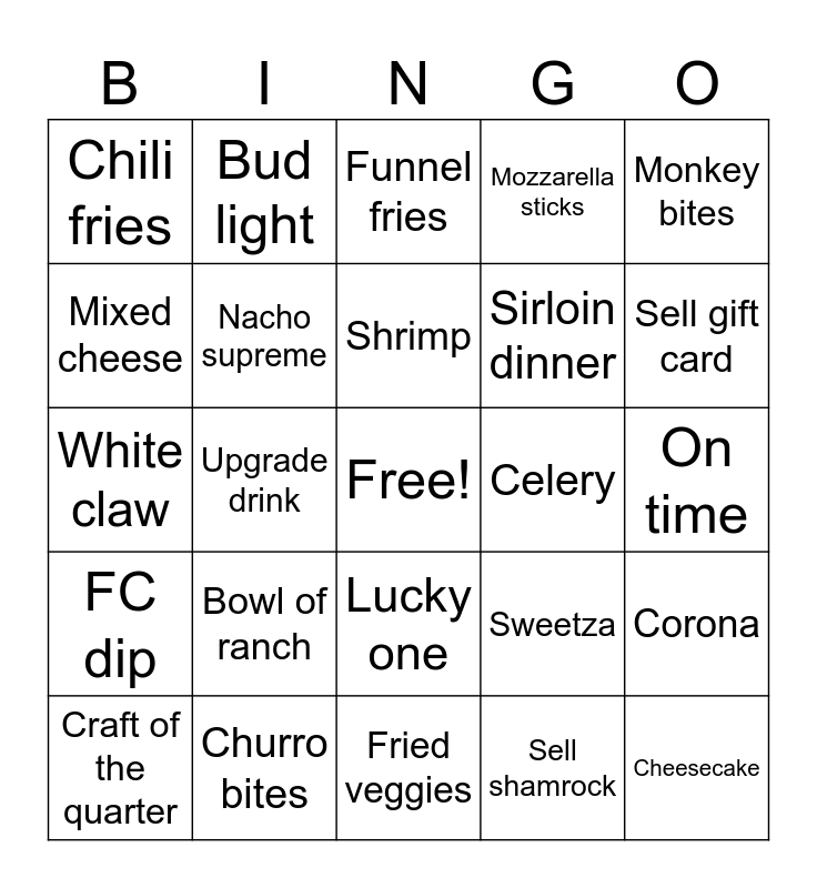 This bingo card has a free space and 29 words: Craft of the quarter, Name tag, Upgrade drink, Pretzel bites, Chili fries, Funnel fries, Nacho supreme, Bowl of ranch, Celery, Churro bites, On time, Cheesecake, Fried veggies, Sell shamrock, Sell gift card, Get a tattle, Lucky one, FC dip, Monkey bites, White claw, Sweetza, Cheese fries, Sirloin dinner, Mixed cheese, Mozzarella sticks, Bud light, Corona, Shrimp and Onion straws.