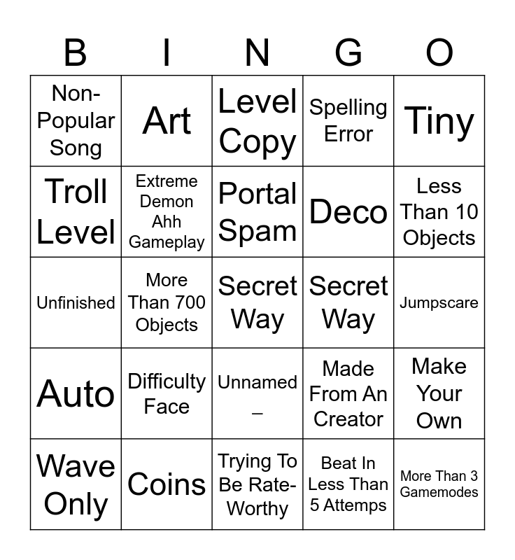 This bingo card has 25 words: Difficulty Face, Trying To Be Rate-Worthy, Portal Spam, Wave Only, Tiny, Non-Popular Song, Troll Level, Art, Secret Way, Unnamed _, Deco, Unfinished, Made From An Creator, Make Your Own, Extreme Demon Ahh Gameplay, More Than 3 Gamemodes, Jumpscare, Level Copy, Less Than 10 Objects, More Than 700 Objects, Secret Way, Coins, Auto, Spelling Error and Beat In Less Than 5 Attemps.