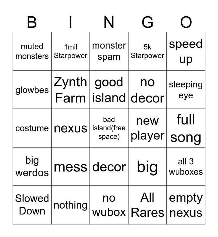 This bingo card has a free space and 24 words: mess, nothing, good island, Slowed Down, speed up, muted monsters, glowbes, 1mil Starpower, new player, decor, no decor, costume, big, all 3 wuboxes, Zynth Farm, All Rares, full song, monster spam, sleeping eye, nexus, empty nexus, big werdos, 5k Starpower and no wubox.