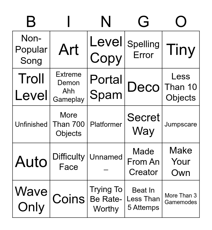 This bingo card has 25 words: Difficulty Face, Trying To Be Rate-Worthy, Portal Spam, Wave Only, Tiny, Non-Popular Song, Troll Level, Art, Secret Way, Unnamed _, Deco, Unfinished, Made From An Creator, Make Your Own, Extreme Demon Ahh Gameplay, More Than 3 Gamemodes, Jumpscare, Level Copy, Less Than 10 Objects, More Than 700 Objects, Platformer, Coins, Auto, Spelling Error and Beat In Less Than 5 Attemps.