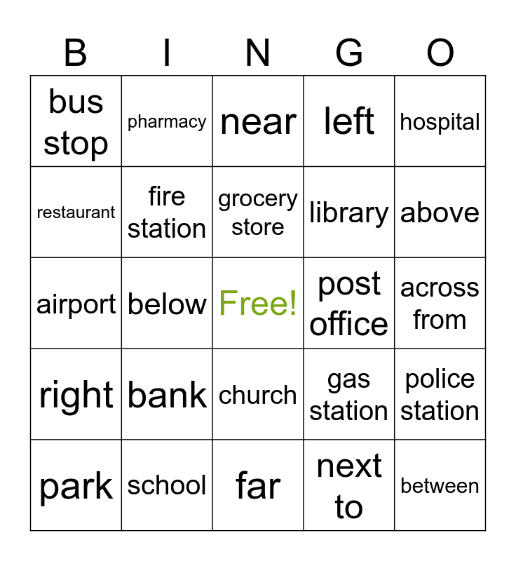 This bingo card has a free space and 24 words: bank, school, grocery store, park, hospital, bus stop, restaurant, pharmacy, post office, church, library, airport, gas station, police station, fire station, next to, across from, near, above, below, between, right, left and far.