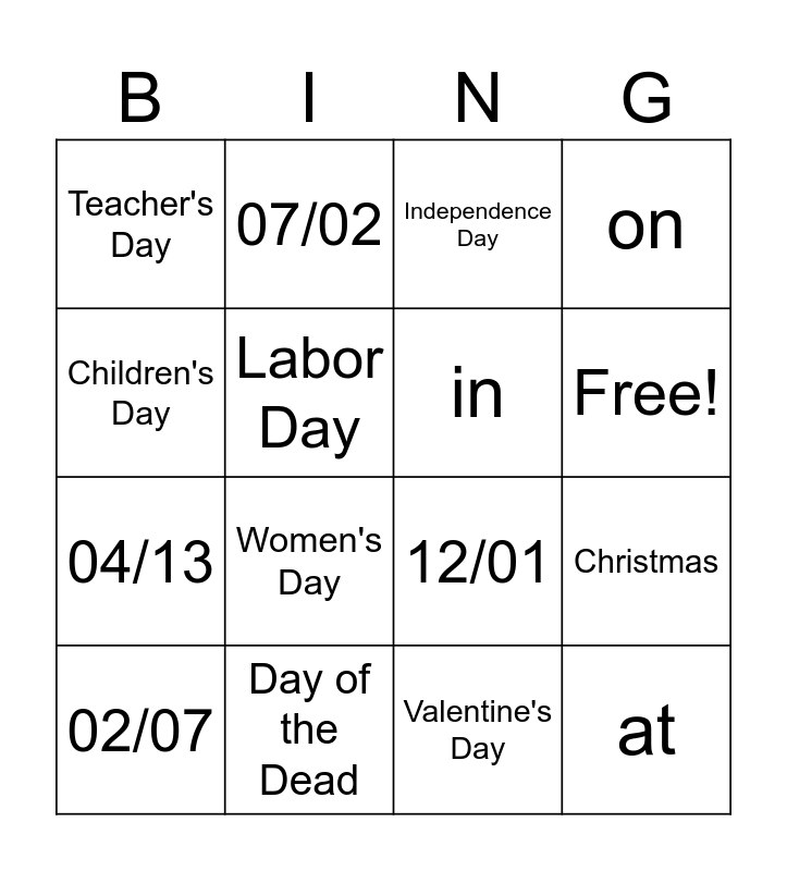 This bingo card has 18 words: Women's Day, at, Independence Day, Teacher's Day, 12/01, on, 02/07, 07/02, Free!, 04/13, Valentine's Day, Children's Day, Christmas, Labor Day, in, Mother's Day, Day of the Dead and New Year's.