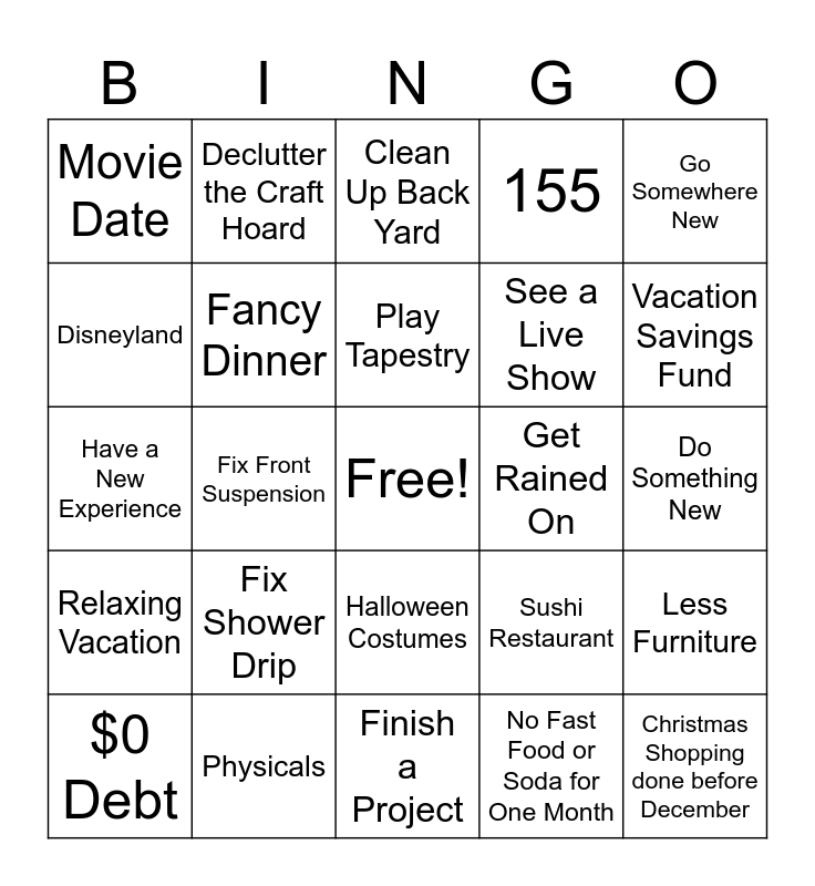 This bingo card has a free space and 24 words: Fix Shower Drip, Physicals, Play Tapestry, $0 Debt, Go Somewhere New, Movie Date, Disneyland, Declutter the Craft Hoard, Get Rained On, Halloween Costumes, See a Live Show, Have a New Experience, Sushi Restaurant, Less Furniture, Fancy Dinner, No Fast Food or Soda for One Month, Do Something New, Clean Up Back Yard, Vacation Savings Fund, Fix Front Suspension, Christmas Shopping done before December, Relaxing Vacation, 155 and Finish a Project.