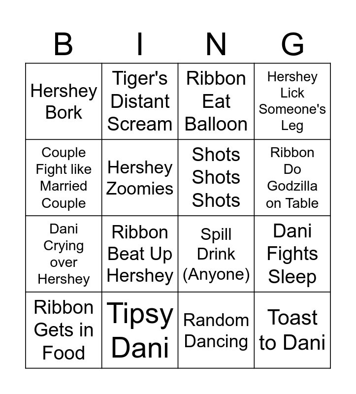 This bingo card has 16 words: Tipsy Dani, Dani Fights Sleep, Ribbon Eat Balloon, Hershey Bork, Dani Crying over Hershey, Tiger's Distant Scream, Spill Drink (Anyone), Random Dancing, Couple Fight like Married Couple, Hershey Zoomies, Ribbon Gets in Food, Hershey Lick Someone's Leg, Ribbon Beat Up Hershey, Ribbon Do Godzilla on Table, Shots Shots Shots and Toast to Dani.