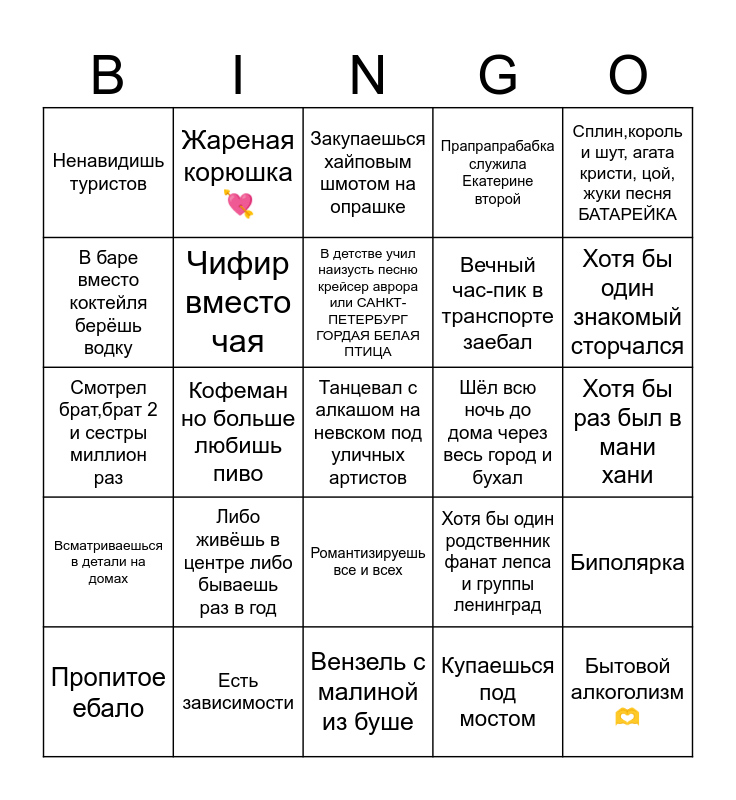 This bingo card has a free space and 24 words: Либо живёшь в центре либо бываешь раз в год, Есть зависимости, В детстве учил наизусть песню крейсер аврора или САНКТ-ПЕТЕРБУРГ ГОРДАЯ БЕЛАЯ ПТИЦА, Пропитое ебало, Сплин,король и шут, агата кристи, цой, жуки песня БАТАРЕЙКА, Ненавидишь туристов, В баре вместо коктейля берёшь водку, Жареная корюшка 💘, Шёл всю ночь до дома через весь город и бухал, Романтизируешь все и всех, Вечный час-пик в транспорте заебал, Смотрел брат,брат 2 и сестры миллион раз, Хотя бы один родственник фанат лепса и группы ленинград, Биполярка, Чифир вместо чая, Купаешься под мостом, Хотя бы раз был в мани хани, Закупаешься хайповым шмотом на опрашке, Хотя бы один знакомый сторчался, Кофеман но больше любишь пиво, Бытовой алкоголизм🫶, Всматриваешься в детали на домах, Прапрапрабабка служила Екатерине второй and Вензель с малиной из буше.
