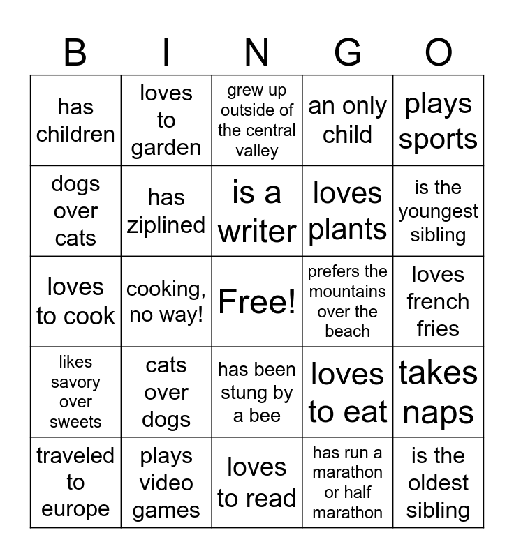 This bingo card has a free space and 24 words: cats over dogs, plays video games, is a writer, traveled to europe, plays sports, has children, dogs over cats, loves to garden, prefers the mountains over the beach, has been stung by a bee, loves plants, loves to cook, loves to eat, takes naps, has ziplined, has run a marathon or half marathon, loves french fries, grew up outside of the central valley, is the youngest sibling, cooking, no way!, is the oldest sibling, likes savory over sweets, an only child and loves to read.