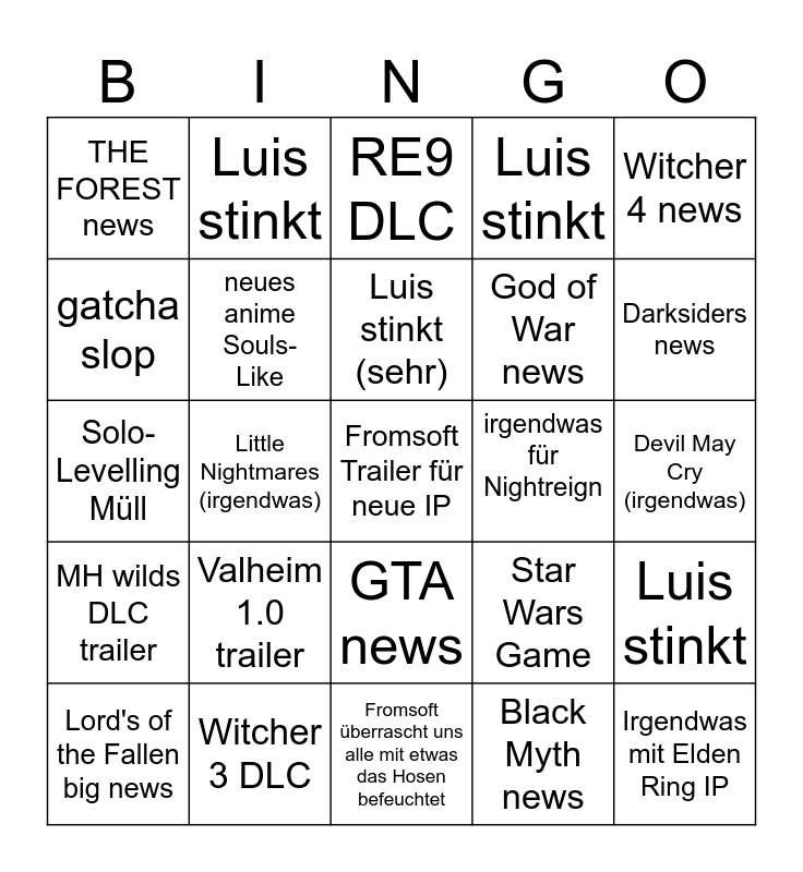 This bingo card has a free space and 29 words: Lord's of the Fallen big news, BLOODBORNE, Little Nightmares (irgendwas), Miyazaki., THE FOREST news, RE9 DLC, neues anime Souls-Like, Valheim 1.0 trailer, irgendwas für Nightreign, Witcher 3 DLC, Devil May Cry (irgendwas), Irgendwas mit Elden Ring IP, Fromsoft überrascht uns alle mit etwas das Hosen befeuchtet, Black Myth news, Darksiders news, news für Duskbloods, GTA news, MH wilds DLC trailer, Witcher 4 news, Solo-Levelling Müll, Star Wars Game, Bradley the Badger news, God of War news, gatcha slop, Luis stinkt, Luis stinkt, Luis stinkt, Luis stinkt (sehr) and Luis stinkt.