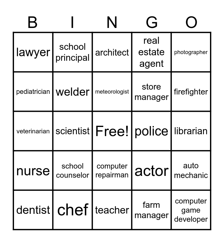 This bingo card has a free space and 24 words: school counselor, chef, meteorologist, dentist, photographer, lawyer, pediatrician, school principal, police, computer repairman, store manager, veterinarian, actor, auto mechanic, welder, farm manager, librarian, architect, firefighter, scientist, computer game developer, nurse, real estate agent and teacher.