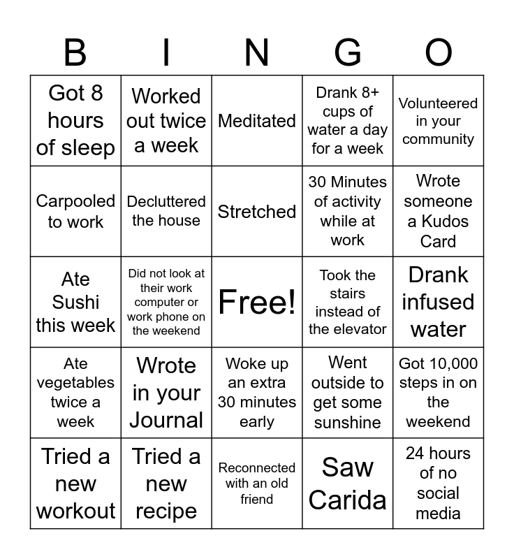 This bingo card has a free space and 24 words: Wrote in your Journal, Tried a new recipe, Stretched, Tried a new workout, Volunteered in your community, Got 8 hours of sleep, Carpooled to work, Worked out twice a week, Took the stairs instead of the elevator, Woke up an extra 30 minutes early, 30 Minutes of activity while at work, Ate Sushi this week, Went outside to get some sunshine, Got 10,000 steps in on the weekend, Decluttered the house, Saw Carida, Drank infused water, Meditated, Wrote someone a Kudos Card, Did not look at their work computer or work phone on the weekend, 24 hours of no social media, Ate vegetables twice a week, Drank 8+ cups of water a day for a week and Reconnected with an old friend.