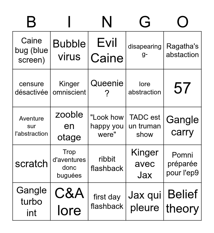 This bingo card has a free space and 24 words: Trop d'aventures donc buguées, C&A lore, Queenie ?, Gangle turbo int, Ragatha's abstaction, Caine bug (blue screen), censure désactivée, Bubble virus, TADC est un truman show, ribbit flashback, lore abstraction, Aventure sur l'abstraction, Kinger avec Jax, Pomni préparée pour l'ep9, Kinger omniscient, Jax qui pleure, Gangle carry, Evil Caine, 57, zooble en otage, Belief theory, scratch, disapearing g- and first day flashback.
