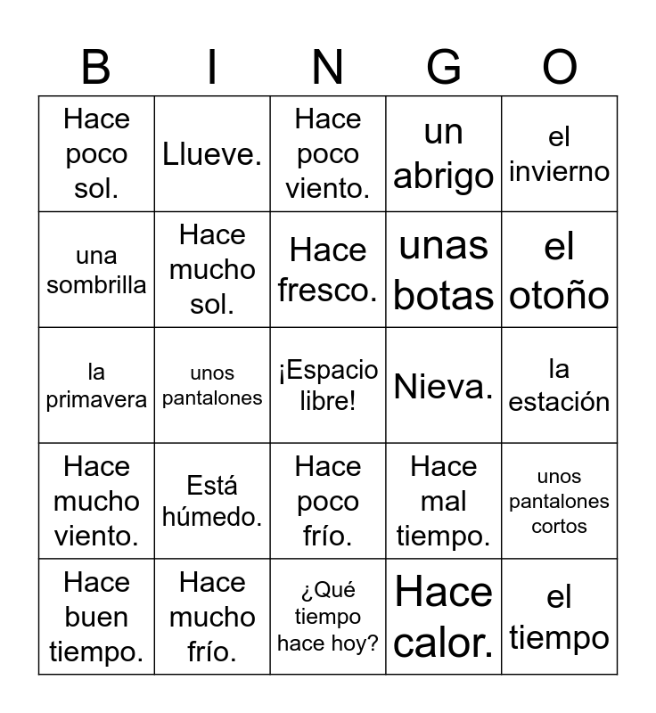 This bingo card has a free space and 34 words: Hace sol., Hace calor., Está nublado., el verano, Hace mucho viento., Hace mucho sol., el invierno, Hace buen tiempo., Llueve., Hace frío., Hace fresco., Hace poco viento., Relampaguea., Hace más o menos tiempo., Nieva., el otoño, Hace mucho frío., la primavera, Está húmedo., Hace mal tiempo., Hace poco frío., Hace viento., Hace poco sol., la estación, ¿Qué tiempo hace hoy?, el tiempo, un abrigo, un suéter, unas botas, una sombrilla, una camiseta, unos pantalones, unos pantalones cortos and unos zapatos.