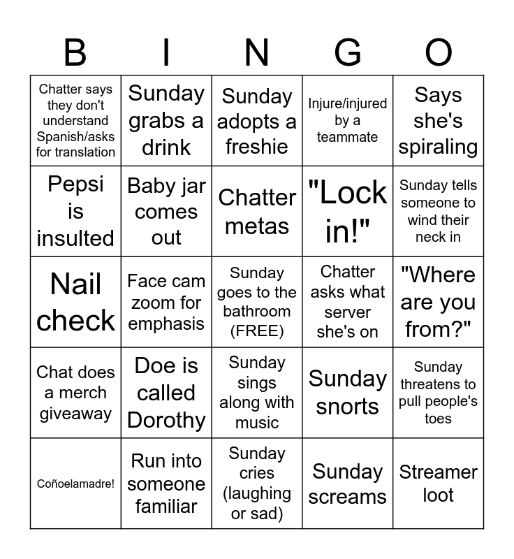 This bingo card has a free space and 24 words: Doe is called Dorothy, Run into someone familiar, Chatter metas, Coñoelamadre!, Says she's spiraling, Chatter says they don't understand Spanish/asks for translation, Pepsi is insulted, Sunday grabs a drink, Chatter asks what server she's on, Sunday sings along with music, "Lock in!", Nail check, Sunday snorts, Sunday threatens to pull people's toes, Baby jar comes out, Sunday screams, "Where are you from?", Sunday adopts a freshie, Sunday tells someone to wind their neck in, Face cam zoom for emphasis, Streamer loot, Chat does a merch giveaway, Injure/injured by a teammate and Sunday cries (laughing or sad).