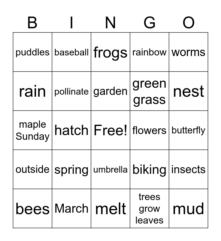 This bingo card has a free space and 24 words: spring, March, garden, bees, worms, puddles, rain, baseball, flowers, umbrella, green grass, maple Sunday, biking, insects, pollinate, trees grow leaves, butterfly, frogs, nest, hatch, mud, outside, rainbow and melt.