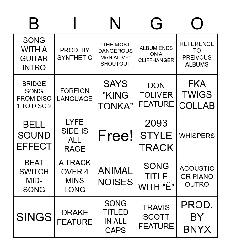 This bingo card has a free space and 24 words: A TRACK OVER 4 MINS LONG, DRAKE FEATURE, SAYS "KING TONKA", SINGS, REFERENCE TO PREIVOUS ALBUMS, SONG WITH A GUITAR INTRO, BRIDGE SONG FROM DISC 1 TO DISC 2, PROD. BY SYNTHETIC, 2093 STYLE TRACK, ANIMAL NOISES, DON TOLIVER FEATURE, BELL SOUND EFFECT, SONG TITLE WITH "Ë", ACOUSTIC OR PIANO OUTRO, FOREIGN LANGUAGE, TRAVIS SCOTT FEATURE, WHISPERS, "THE MOST DANGEROUS MAN ALIVE" SHOUTOUT, FKA TWIGS COLLAB, LYFE SIDE IS ALL RAGE, PROD. BY BNYX, BEAT SWITCH MID-SONG, ALBUM ENDS ON A CLIFFHANGER and SONG TITLED IN ALL CAPS.