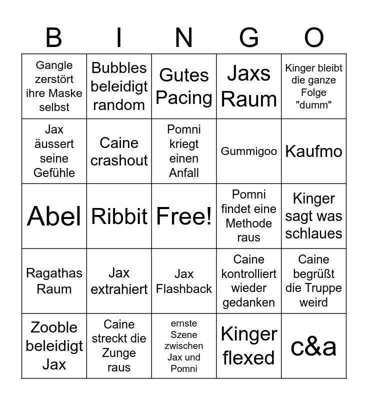 This bingo card has a free space and 24 words: Jax extrahiert, Caine streckt die Zunge raus, Pomni kriegt einen Anfall, Zooble beleidigt Jax, Kinger bleibt die ganze Folge "dumm", Gangle zerstört ihre Maske selbst, Jax äussert seine Gefühle, Bubbles beleidigt random, Pomni findet eine Methode raus, Jax Flashback, Gummigoo, Abel, Caine kontrolliert wieder gedanken, Caine begrüßt die Truppe weird, Caine crashout, Kinger flexed, Kinger sagt was schlaues, Gutes Pacing, Kaufmo, Ribbit, c&a, Ragathas Raum, Jaxs Raum and ernste Szene zwischen Jax und Pomni.