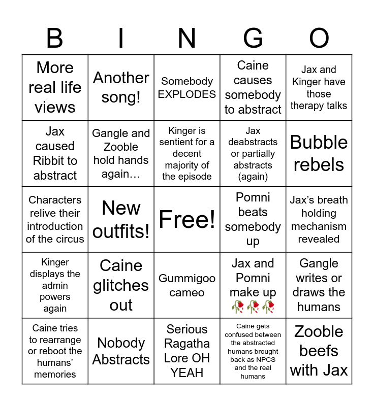This bingo card has a free space and 24 words: Caine glitches out, Nobody Abstracts, Kinger is sentient for a decent majority of the episode, Caine tries to rearrange or reboot the humans’ memories, Jax and Kinger have those therapy talks, More real life views, Jax caused Ribbit to abstract, Another song!, Pomni beats somebody up, Gummigoo cameo, Jax deabstracts or partially abstracts (again), Characters relive their introduction of the circus, Jax and Pomni make up 🥀🥀🥀, Gangle writes or draws the humans, Gangle and Zooble hold hands again…, Caine gets confused between the abstracted humans brought back as NPCS and the real humans, Jax’s breath holding mechanism revealed, Somebody EXPLODES, Bubble rebels, New outfits!, Zooble beefs with Jax, Kinger displays the admin powers again, Caine causes somebody to abstract and Serious Ragatha Lore OH YEAH.