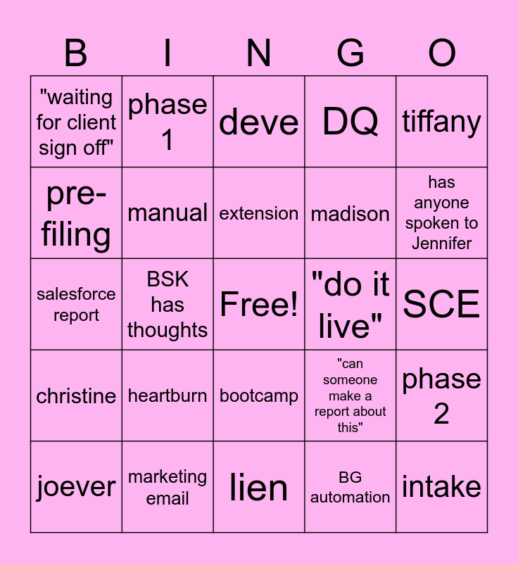 This bingo card has a free space and 24 words: heartburn, marketing email, extension, joever, tiffany, "waiting for client sign off", pre-filing, phase 1, "do it live", bootcamp, madison, salesforce report, "can someone make a report about this", phase 2, manual, BG automation, SCE, deve, has anyone spoken to Jennifer, BSK has thoughts, intake, christine, DQ and lien.
