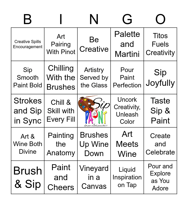 This bingo card has a free space and 35 words: Wine Down & Masterpiece Up, Brush and Bottle Bliss, Tamica's Birthday, Chilling With the Brushes, Brushes Up Wine Down, Palette and Martini, Sip Smooth Paint Bold, Make Art With Every Sip, Artistry Served by the Glass, Where Picasso Meets Rose, Strokes and Sip in Sync, Titos Fuels Creativity, Splash Color Pour Courage, Art Gets Better With Refills, Creative Spills Encouragement, Uncork Creativity, Unleash Color, Liquid Inspiration on Tap, Chill & Skill with Every Fill, Art & Wine Both Divine, Pour and Explore as You Adore, Art Meets Wine, Brush & Sip, Create and Celebrate, Paint and Cheers, Be Creative, Sip Joyfully, Mix and Sip, Art and Sip Unite, Pour Paint Perfection, Taste Sip & Paint, Uncork & Unleash Art, Vineyard in a Canvas, Painting the Anatomy, Art Pairing With Pinot and Sip Paint Relaz.