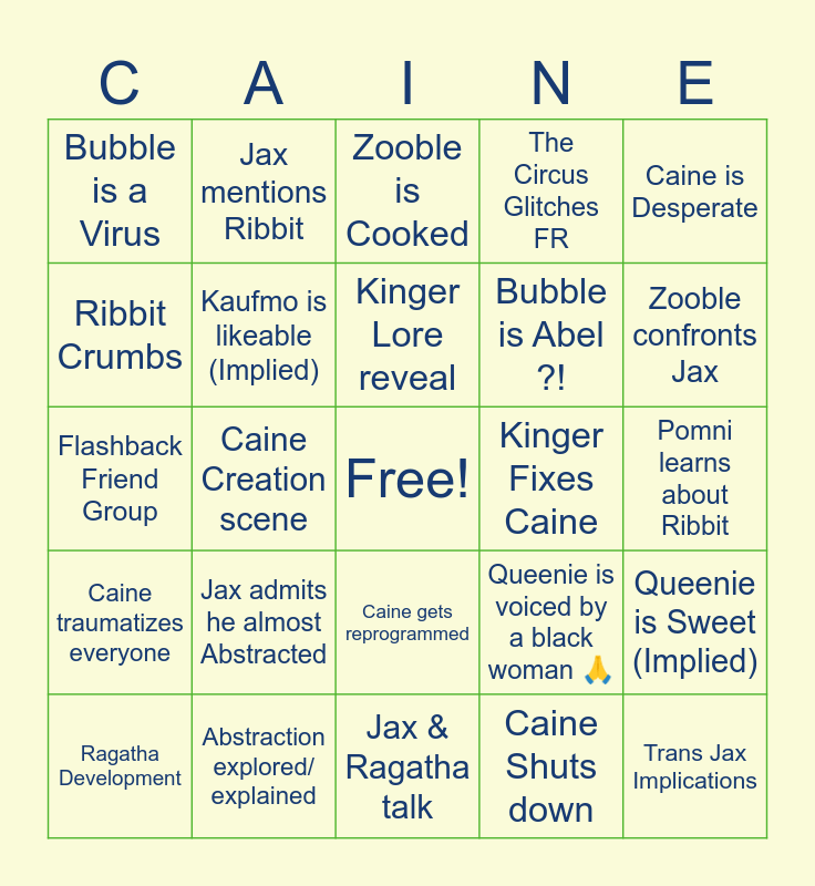 This bingo card has a free space and 50 words: AWKWARD scene, Trans Jax Implications, Jax Crys / Panic Attack, Jax & Ragatha talk, Jax admits he almost Abstracted, Jax fumbled Ribbit BAD, Jax mentions Ribbit, Jax starts working through his issues, Ribbit Crumbs, Ribbit is Diva (Implied), Kaufmo is likeable (Implied), The Circus Glitches FR, Queenie is Sweet (Implied), Queenie is voiced by a black woman 🙏, NPCs of Abstracted, Kinger Locks in, Kinger Lore reveal, Kinger Fixes Caine, Caine Crashes Out, Caine is Desperate, Caine Creation scene, Caine Shuts down, Bubble is a Virus, Bubble is Abel ?!, Jax-Rag Backstory is Messy, The Flashback is longer than 3 minutes, Zooble confronts Jax, Zooble confronts Caine, Zooble is Cooked, Caine gets reprogrammed, Caine triggers someones PTSD, No one actually Abstracts, Real C&A LORE, Void explored/ explained, Abstraction explored/ explained, Never an Escape, Big Reveal, Emotional Hug, The cast gets along, Pomni learns about Ribbit, Kinger & Jax Convo, Pomni & Jax actual Convo, Pomni & Kinger try fixing Caine, Jax feels remorse, Ragatha Development, Flashback Friend Group, Flashback Arguement, Adventure speed run, Caine traumatizes everyone and Carnival Adventure.