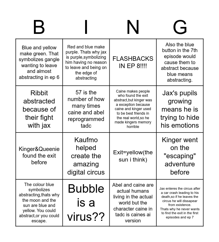 This bingo card has 16 words: Bubble is a virus??, Kinger went on the "escaping" adventure before, FLASHBACKS IN EP 8!!!!, Blue and yellow make green. That symbolizes gangle wanting to leave and almost abstracting in ep 6, Kinger&Queenie found the exit before, Red and blue make purple. Thats why jax is purple,symbolizing him having no reason to leave and being on the edge of abstracting, Exit=yellow(the sun i think), Abel and caine are actual humans living in the actual world but the character caine in tadc is caines ai version, Ribbit abstracted because of their fight with jax, 57 is the number of how many times caine and abel reprogrammed tadc, The colour blue symbolizes abstracting,thats why the moon and the sun are blue and yellow. You could abstract,or you could escape., Also the blue button in the 7th episode would cause them to abstract because blue means abstracting., Kaufmo helped create the amazing digital circus, Jax's pupils growing means he is trying to hide his emotions, Caine makes people who found the exit abstract,but kinger was a exception because caine and kinger used to be best friends in the real world,so he made kingers memory horrible and Jax enteres the circus after a car crash leading to his death,so if he leaves the circus he will dissapear from existence. Thats why he never wants to find the exit in the first episodes and ep 7.