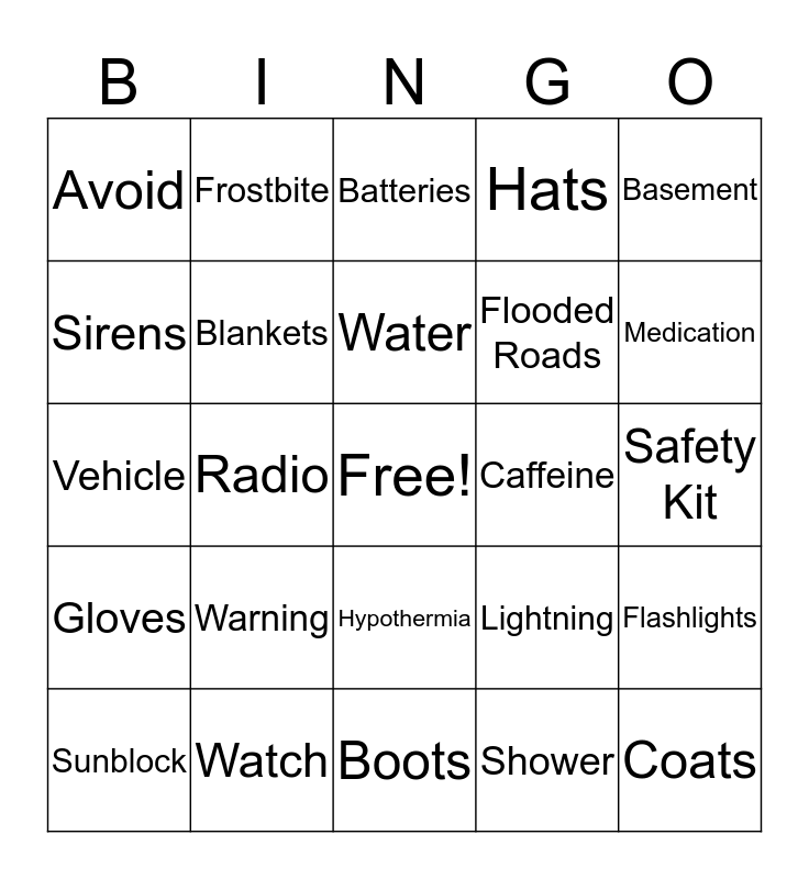 This bingo card has a free space and 24 words: Warning, Watch, Water, Sunblock, Basement, Avoid, Sirens, Frostbite, Caffeine, Hypothermia, Flooded Roads, Vehicle, Lightning, Flashlights, Blankets, Shower, Safety Kit, Batteries, Medication, Radio, Coats, Gloves, Hats and Boots.