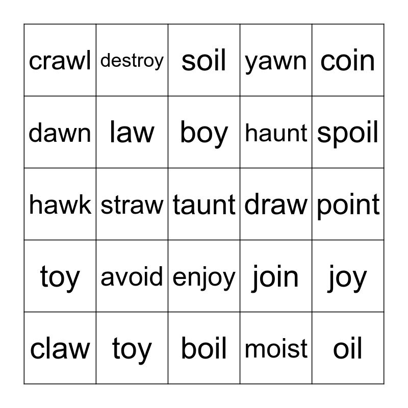 This bingo card has 25 words: avoid, boil, boy, claw, coin, crawl, dawn, destroy, draw, enjoy, haunt, hawk, join, joy, law, oil, point, soil, spoil, straw, taunt, toy, toy, yawn and moist.