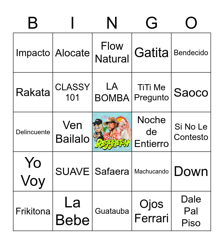 This bingo card has a free space and 28 words: Down, Punto 40, TiTi Me Pregunto, Ojos Ferrari, Rakata, Flow Natural, Alocate, Yo Voy, Noche de Entierro, Frikitona, Delincuente, Gatita, La Bebe, Guatauba, Saoco, DE CAROLINA, SUAVE, CLASSY 101, LA BOMBA, Safaera, Impacto, Quiero Bailar, Dale Pal Piso, Ven Bailalo, Si No Le Contesto, Machucando, Bendecido and Danza Kuduro.