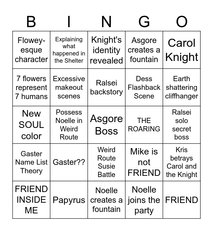 This bingo card has a free space and 24 words: Gaster??, Papyrus, Ralsei backstory, FRIEND INSIDE ME, Carol Knight, Flowey-esque character, 7 flowers represent 7 humans, Explaining what happened in the Shelter, THE ROARING, Weird Route Susie Battle, Dess Flashback Scene, New SOUL color, Mike is not FRIEND, Kris betrays Carol and the Knight, Excessive makeout scenes, Noelle joins the party, Ralsei solo secret boss, Knight's identity revealed, Earth shattering cliffhanger, Possess Noelle in Weird Route, FRIEND, Gaster Name List Theory, Asgore creates a fountain and Noelle creates a fountain.